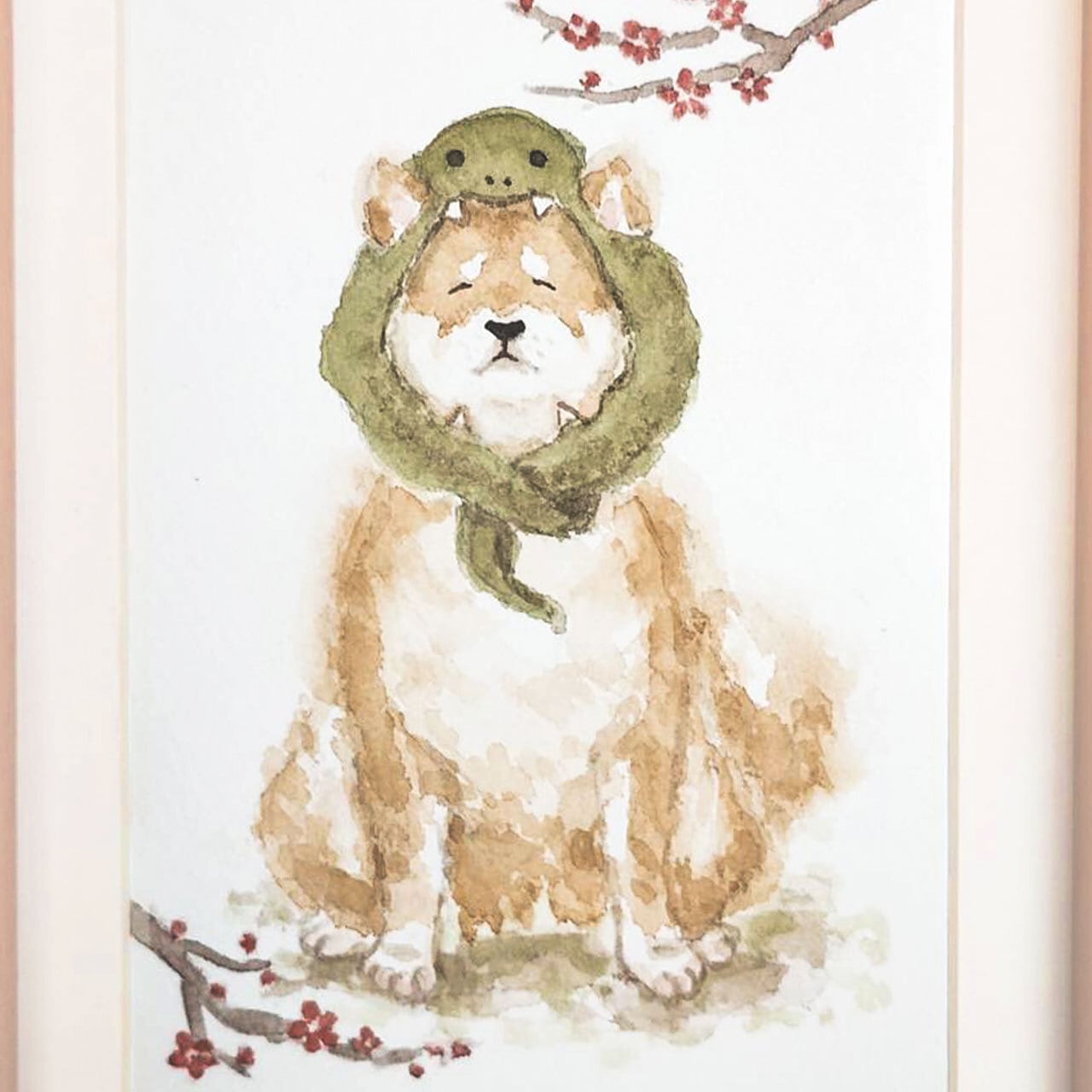 年賀状原画(巳年)/柴犬【水彩画・原画(額縁付き)】1点物